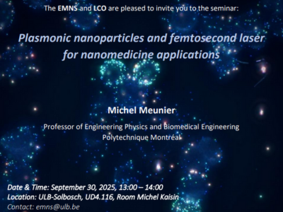 - Plasmonic Nanoparticles and Femtosecond Lasers for Nanomedicine Applications: A Seminar by Prof. Michel Meunier15 septembre 2025The EMNS lab and LCO is pleased to host Prof. Michel Meunier, Professor of Engineering Physics and Biomedical Engineering at Polytechnique Montréal, for a seminar on cutting-edge applications of nanotechnology in medicine.