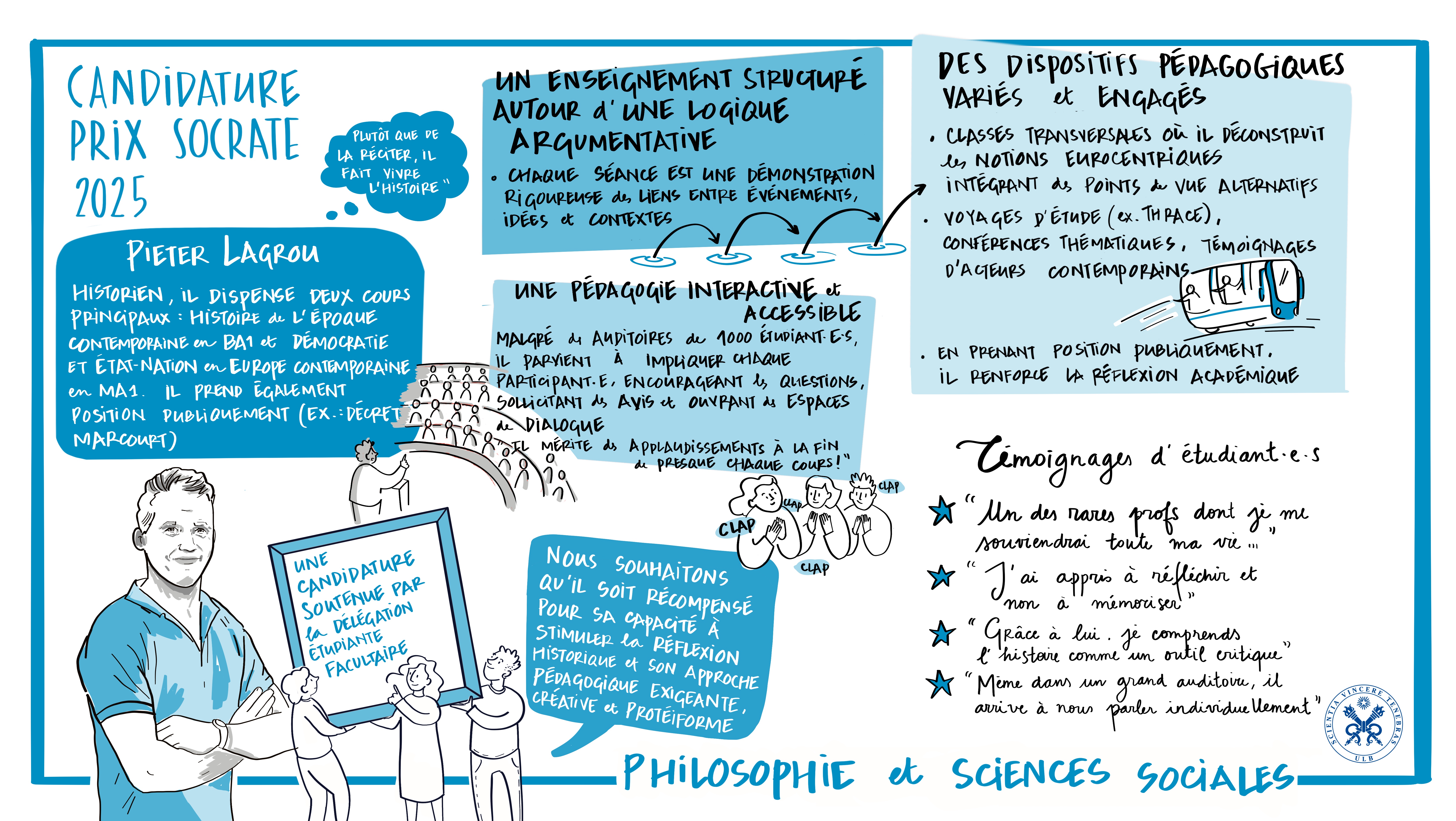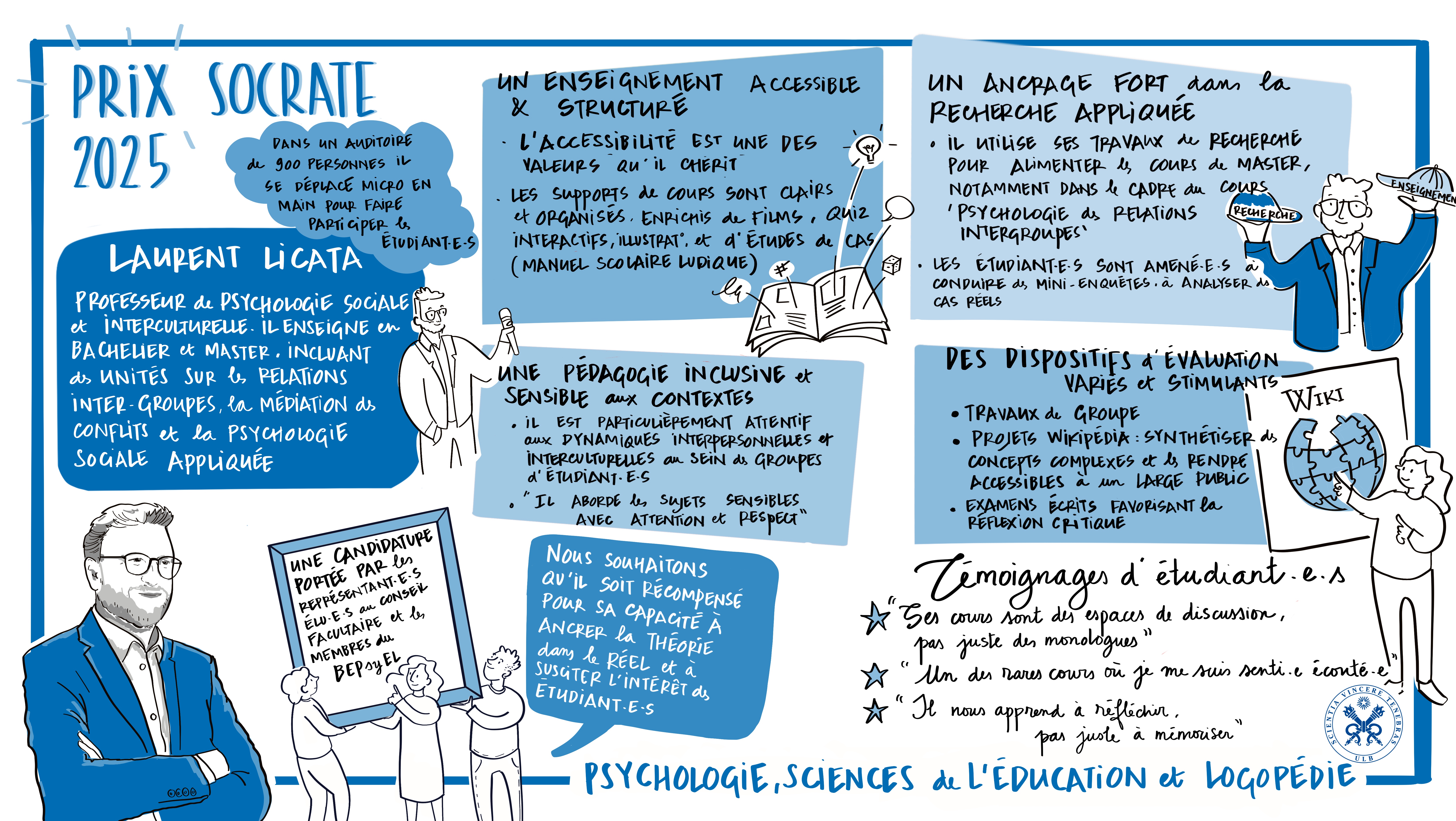 - Lien entre enseignement et recherche : Laurent Licata incarne le modèle Humboldtien, intégrant ses propres recherches et celles d’autres intervenants dans ses cours, et initiant les étudiant·es à la démarche scientifique et à la réflexion critique.