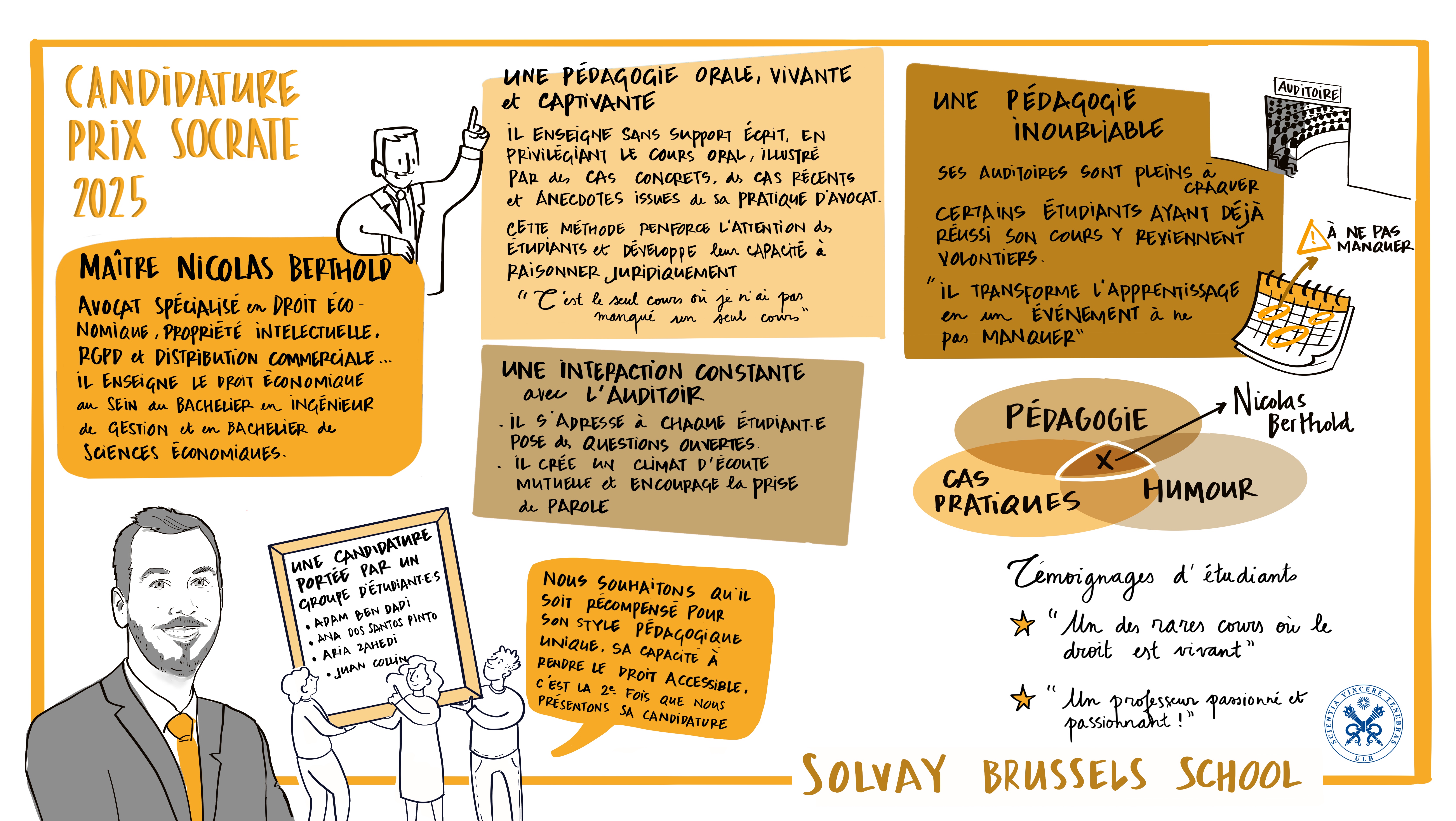 - Créativité et interaction : Il utilise des supports variés (vidéos, quiz, plateformes numériques) pour capter l’attention, encourage la participation même dans les grands amphithéâtres, et met en place des ateliers et projets collaboratifs valorisés par les étudiant·es.