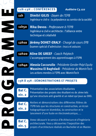 Que vous soyez élève du secondaire, parent ou simplement curieux·se d’en savoir plus sur les études d’ingénieur·e, cette journée est ouverte à toutes et à tous.