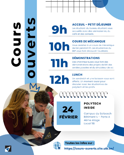 La journée se poursuit avec des démonstrations et des présentations de projets. Vous aurez aussi l'occasion de découvrir le simulateur de vol. De quoi se faire une idée très concrète de ce que signifie étudier l’ingénierie à l’École polytechnique de Bruxelles.